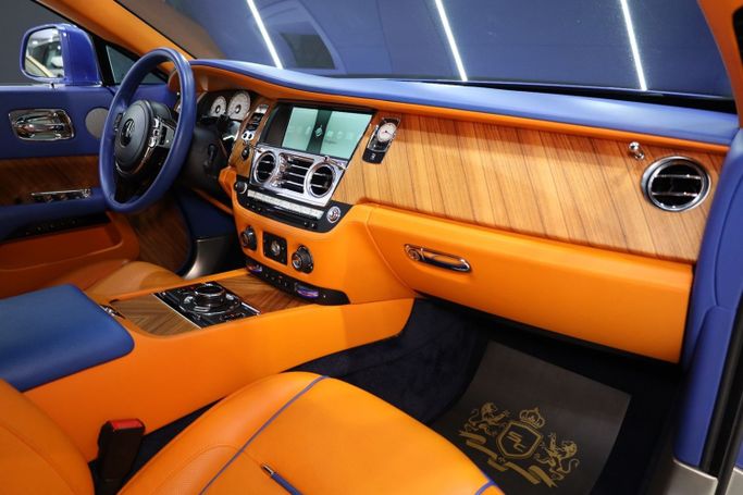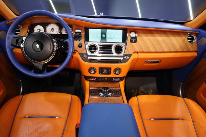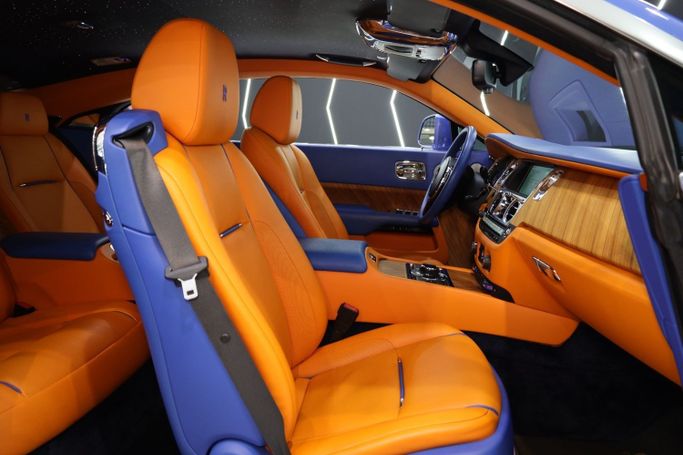 Rolls Royce Wraith GCC Specs, Canadel Panelling to Fascia / Door Panel / Center Console, Starlights Headliner, Ventilated Seats, RR Monogram to All Headrests, Lambswool Floormats, Colored Steering Wheels, Two-Tone Interior, Navigation System, Wi-Fi Hotspot, Blind Spot Assist, Lane Departure Warning, Adaptive Cruise Control, Illuminated Spirit of Ecstasy, Double Orange Coachline, 360° Camera, 21 Inch Wheels