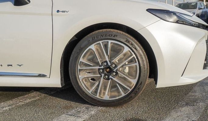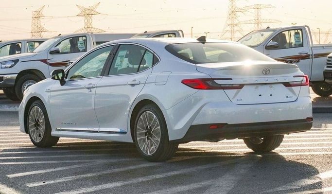 New Toyota Camry LE HEV 2.5L Hybrid for sale from Najem Motors FZE in Dubai. White 2025 model. The car has automatic gearbox, 4 cylinder engine, 18″ wheels and beige interior. GCC specs.