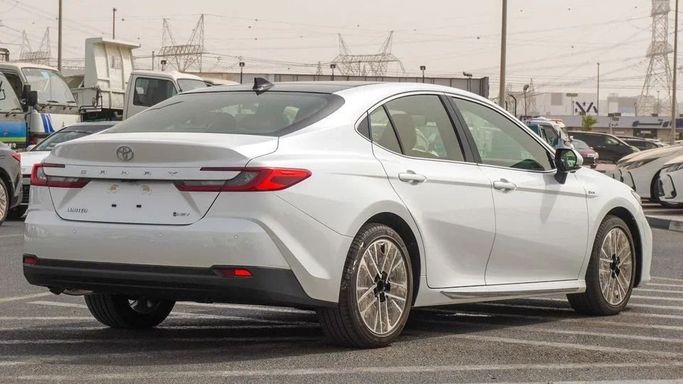 Brand new Toyota Camry E HEV 2.5L HYBRID for sale in Dubai. White 2025 model, available at Najem Motors FZE. This car has automatic transmission, 4 cylinder engine, 16″ wheels and beige interior. GCC specs.
