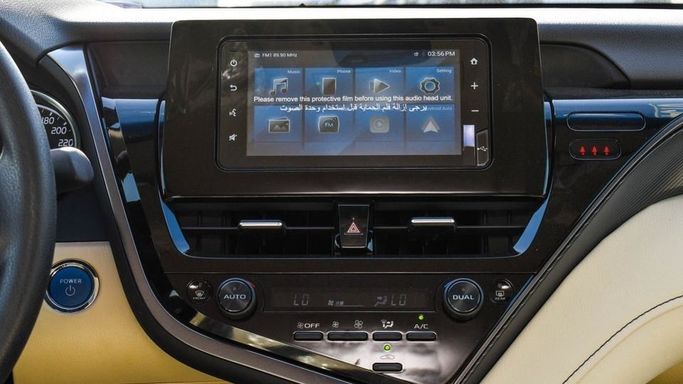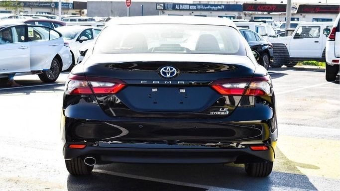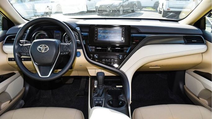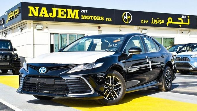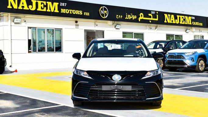 Brand new Toyota Camry Hybrid 2.5L for sale in Dubai. Black 2023 model, available at Najem Motors FZE. This car has automatic transmission, 4 cylinder engine, 17″ wheels and beige interior. GCC specs.