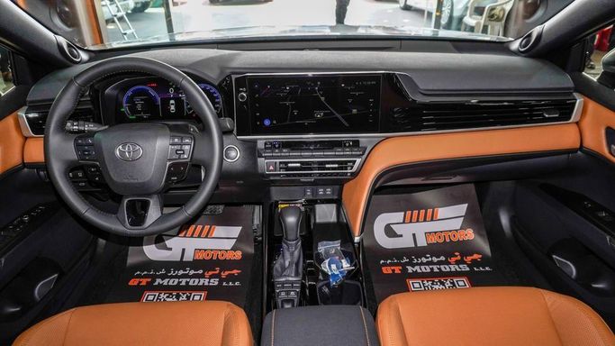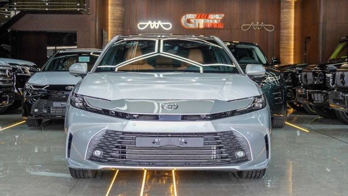 New Toyota Camry Limited HEV 2.5 L Hybrid for sale from Najem Motors FZE in Dubai. Silver 2025 model. The car has automatic gearbox, 4 cylinder engine, 18″ wheels and tan interior. GCC specs.
