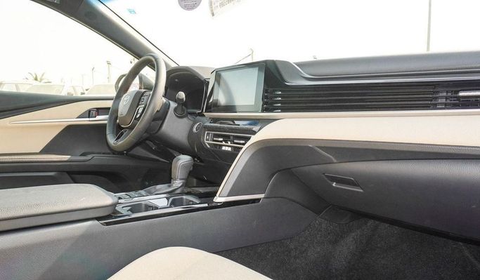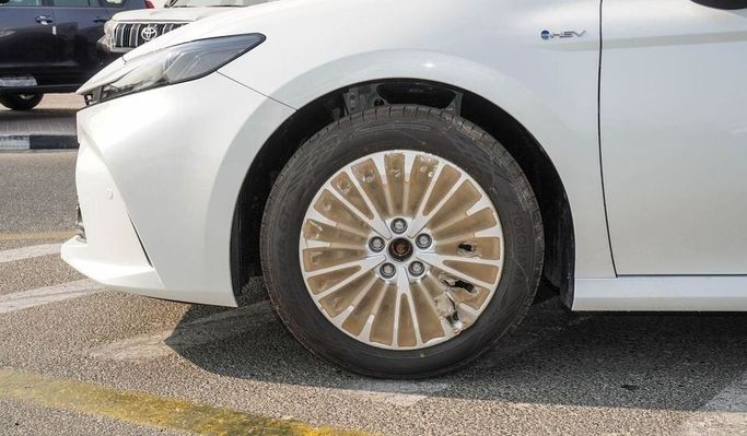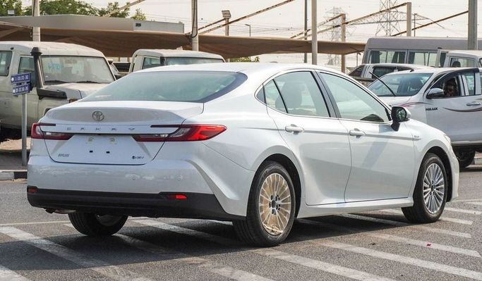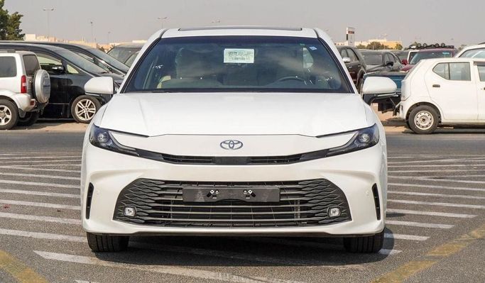 New Toyota Camry 2.5L Hybrid for sale from Najem Motors FZE in Dubai. White 2025 model. The car has automatic gearbox, 6 cylinder engine, 17″ wheels and beige interior. GCC specs.