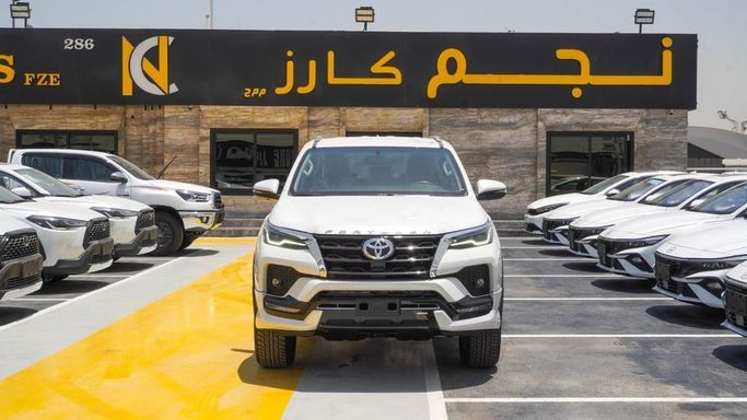 New Toyota Fortuner SR5 4.0 L V6 for sale from Najem Motors FZE in Dubai. White 2025 model. The car has automatic gearbox, 6 cylinder engine, 18″ wheels and black interior. GCC specs.
