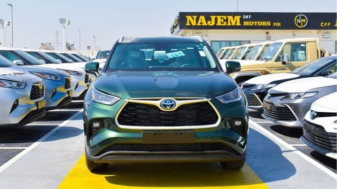 Brand new Toyota Highlander 2.5 L for sale in Dubai. Green 2023 model, available at Najem Motors FZE. This car has automatic transmission, 4 cylinder engine, 20″ wheels and grey interior. GCC specs.