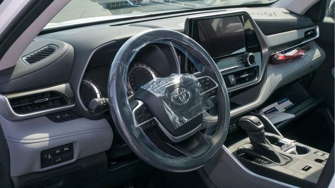 New Toyota Highlander 2.5L Hybrid for sale from Najem Motors FZE in Dubai. White 2024 model. The car has automatic gearbox, 4 cylinder engine, 20″ wheels and grey interior. GCC specs.