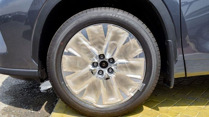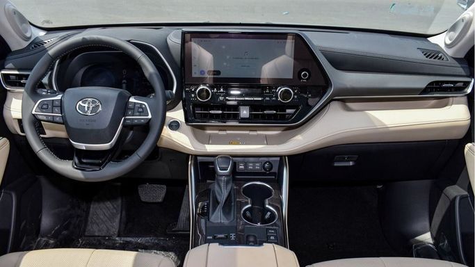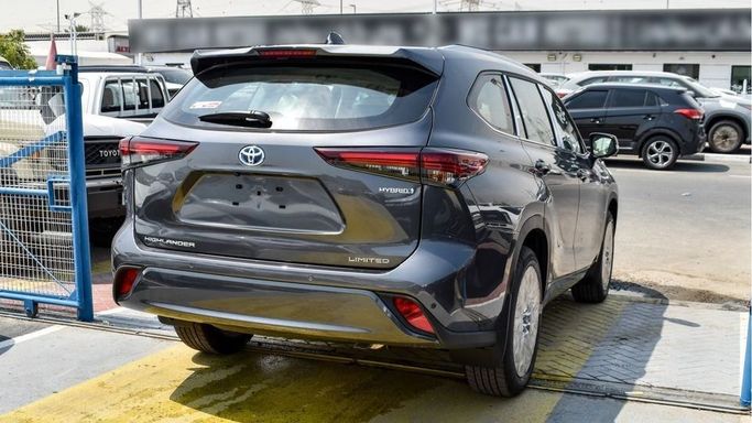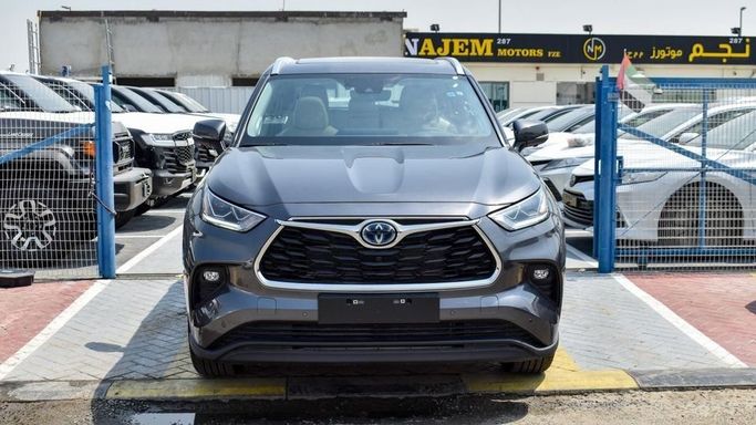 New Toyota Highlander HYBRID LIMITED for sale from Najem Motors FZE in Dubai. Grey 2024 model. The car has automatic gearbox, 4 cylinder engine, 20″ wheels and beige interior. GCC specs.