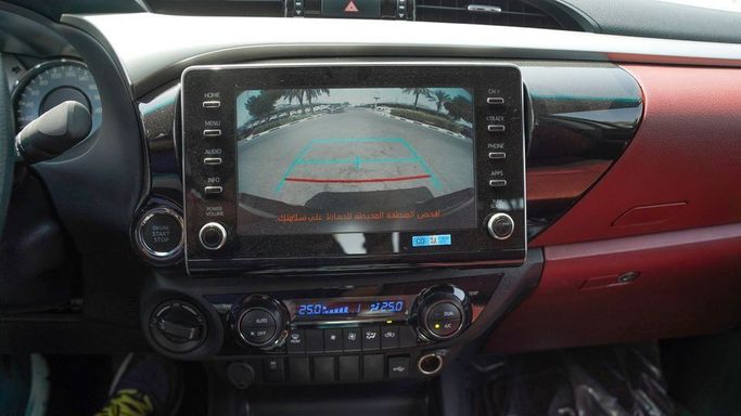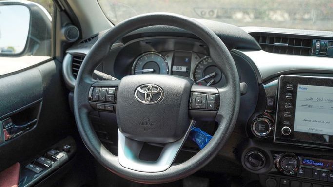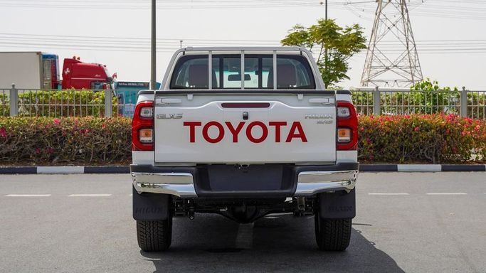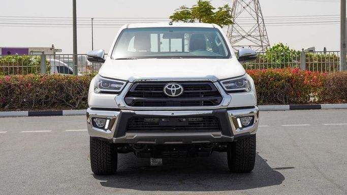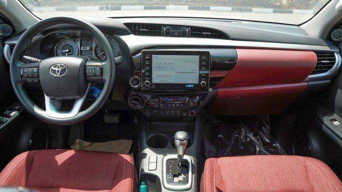 New Toyota Hilux for sale from Najem Motors FZE in Dubai. White 2024 model. The car has automatic gearbox, 4 cylinder engine, 18″ wheels and maroon interior. GCC specs.
