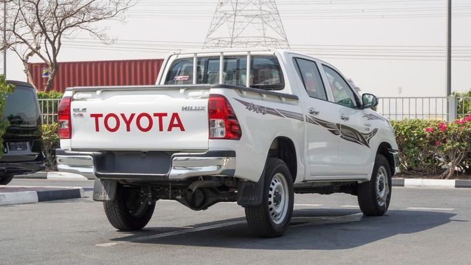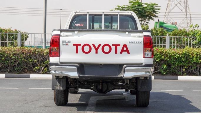 New Toyota Hilux GL 2.4 L d for sale from Najem Motors FZE in Dubai. White 2025 model. The car has manual gearbox, 4 cylinder engine, 17″ wheels and red interior. GCC specs.