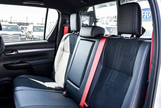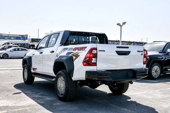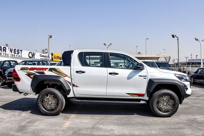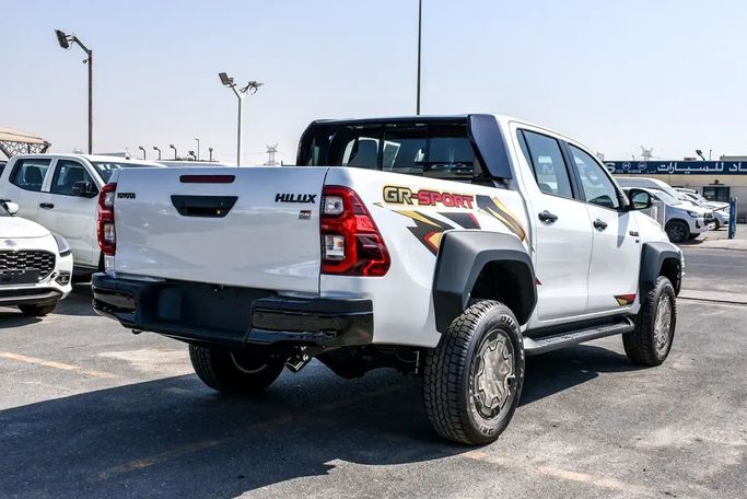 New 2025 Toyota Hilux, VIII Facelift, double cab pickup truck in pure white. Under the hood is a 4.0-liter gasoline engine with a capacity of 238 hp, paired with an automatic transmission and an AWD all-wheel drive system, which ensures confident movement both in the city and on rough terrain. The GCC Regional specification confirms compliance with local requirements and ensures available service support in the region. The interior is focused on comfort and practicality, featuring spacious seats, a roomy cargo compartment, and modern solutions for climate control, multimedi
