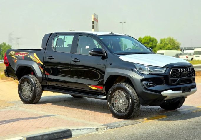 New 2025 Toyota Hilux, VIII Facelift, arrives in a sleek black finish as a versatile double cab pickup built for work and everyday use. This GCC-spec model features all-wheel drive and an automatic transmission paired with a 4.0-litre petrol engine delivering 238 hp, offering steady power and confident low-end response for varied conditions. The facelift updates give a refreshed, more modern silhouette while retaining the robust and durable DNA Hilux is known for, ensuring dependable capability whether carrying cargo, towing, or navigating rougher terrain. Inside, the cabin
