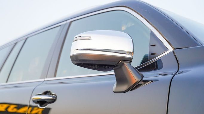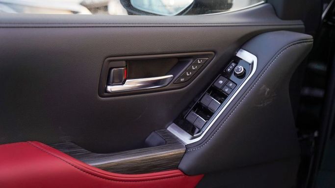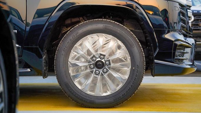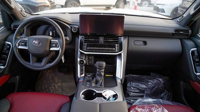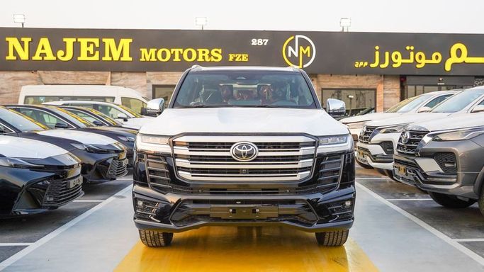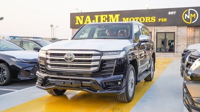 New Toyota Land Cruiser for sale from Najem Motors FZE in Dubai. Black 2025 model. The car has automatic gearbox, 6 cylinder engine, 20″ wheels and red interior. GCC specs.