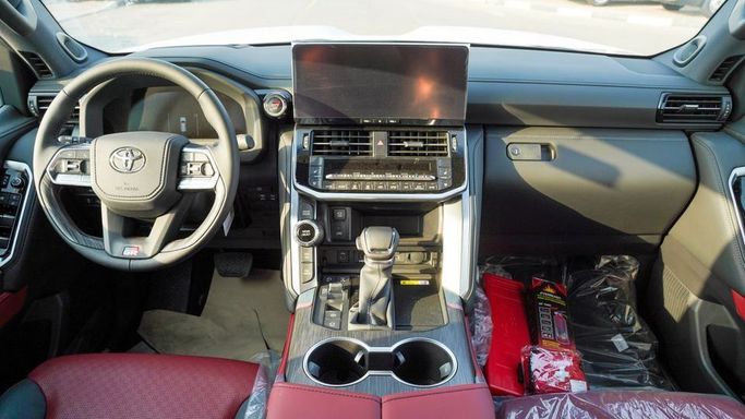 New Toyota Land Cruiser for sale from Najem Motors FZE in Dubai. Black 2025 model. The car has automatic gearbox, 6 cylinder engine, 18″ wheels and red interior. GCC specs.
