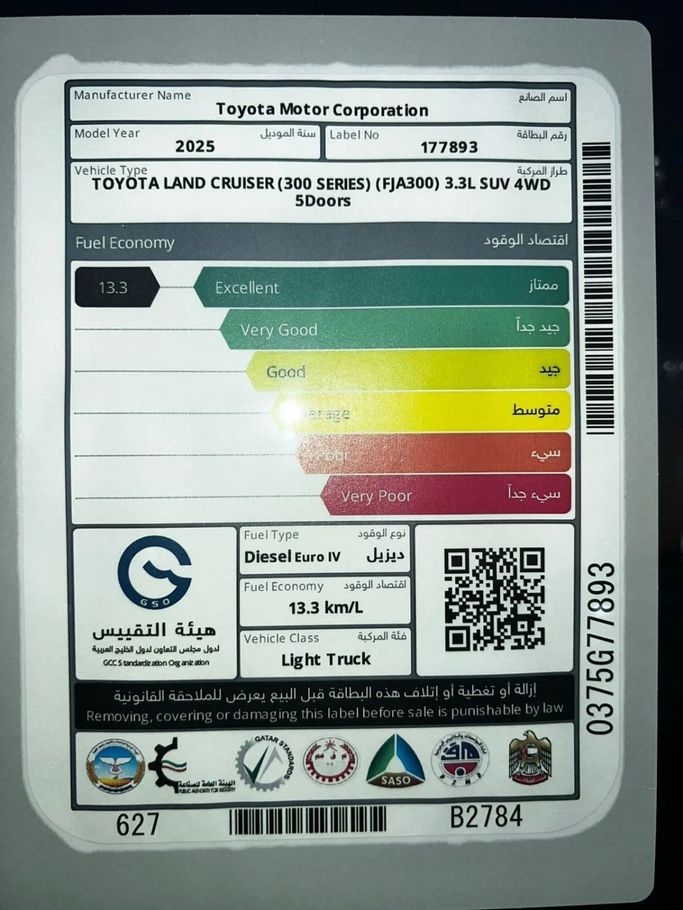 TOYOTA LAND CRUISER VXR 3.3L 2025 Safety - 4WD Exterior - Moonroof - Off-road kit - Off-road tyres - Performance tyres - Sport suspension Interior - AUX audio in - Air conditioning - Alarm - CD player - DVD player - MP3 interface - Power seats with memory - Infotainment - Bluetooth system - Rear TV screens - USB & Auxiliary Cable Comfort & Convenience - Fridge - Navigation system - Power locks - Parking sensor front