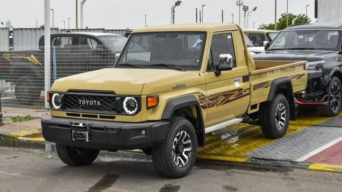 New Toyota Land Cruiser Pick Up 4.0L V6 Petrol Single Cabin A/T for sale from Najem Motors FZE in Dubai. Beige 2024 model. The car has automatic gearbox, 6 cylinder engine, 16″ wheels and tan interior. GCC specs.