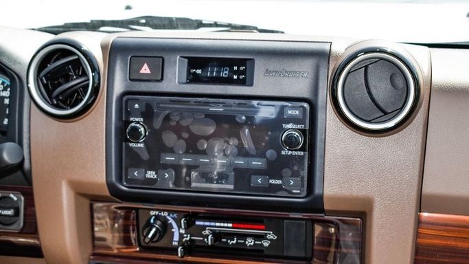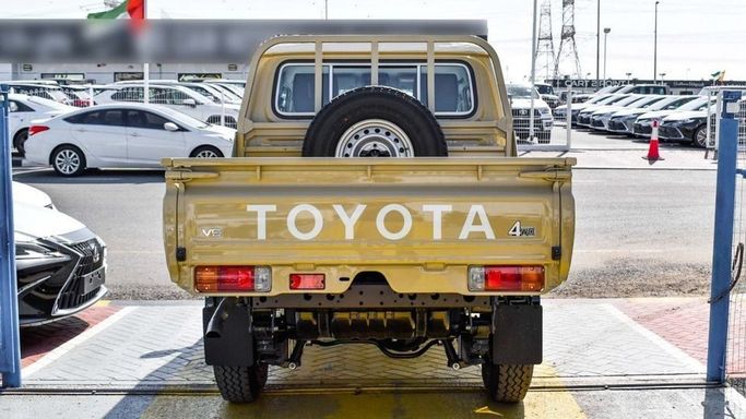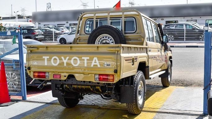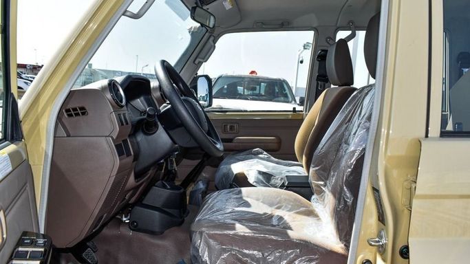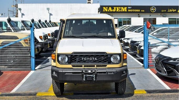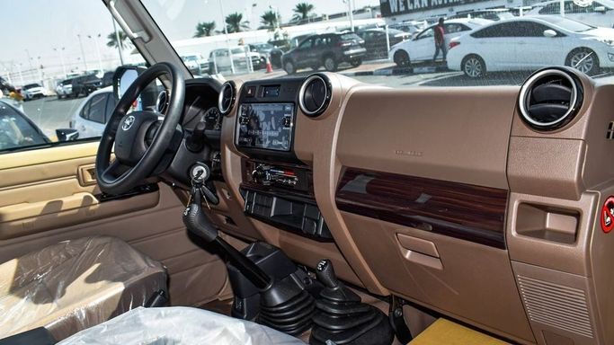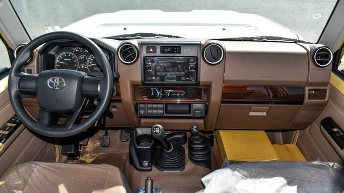 New 2024 Toyota Land Cruiser Pickup for sale in Dubai. Available from Najem Motors FZE. Manual transmission, 6 cylinder engine, 16″ wheels and brown interior. Never driven, GCC specs.
