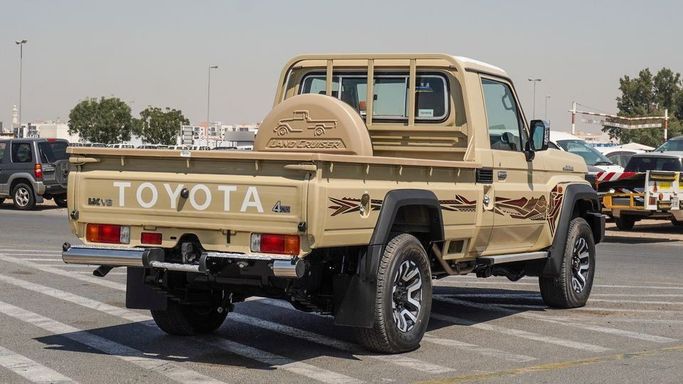 Brand new Toyota Land Cruiser Pick Up 4.0L V6 Single Cabin Auto transmission for sale in Dubai. Beige 2025 model, available at Najem Motors FZE. This car has automatic transmission, 6 cylinder engine, 17″ wheels and tan interior. GCC specs.