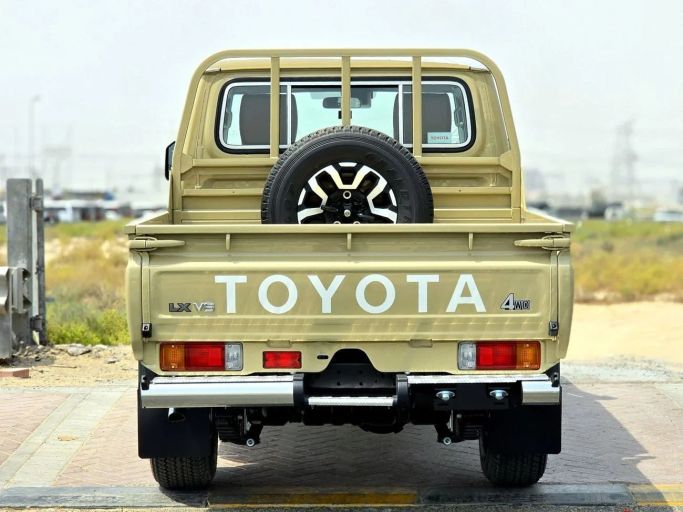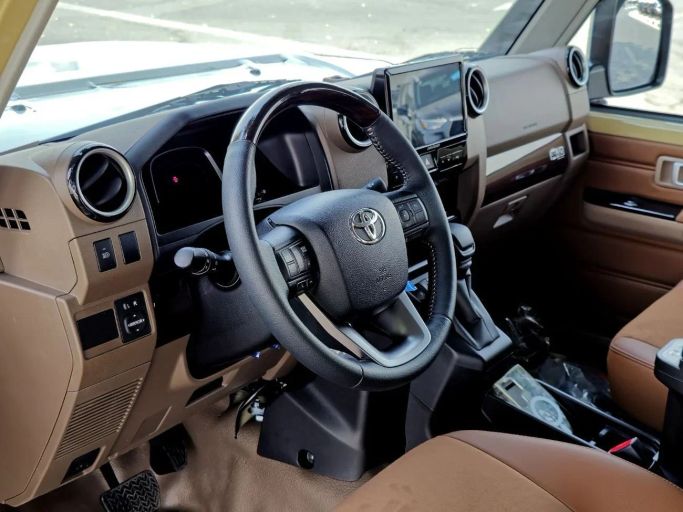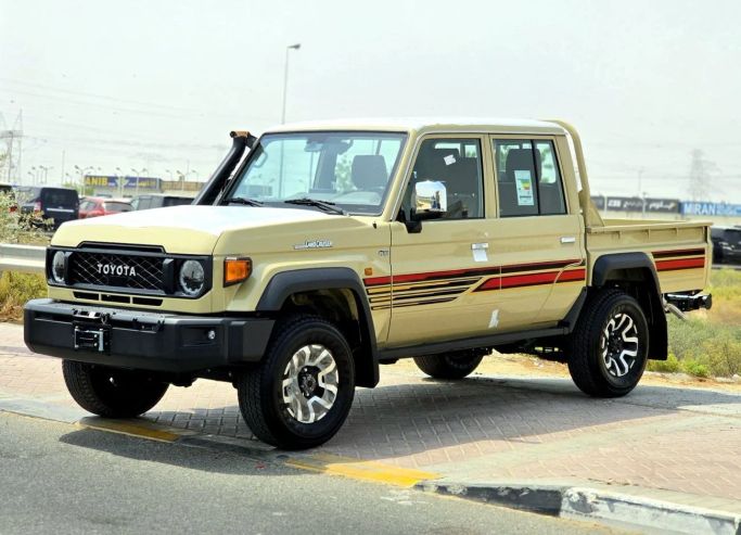 The 2025 Toyota Land Cruiser 70 Series Facelift 2 arrives in GCC-spec trim, finished in Beige with a practical pickup double-cab body. It is powered by a 4.0-liter petrol engine delivering 228 hp, paired with an automatic transmission and all-wheel drive for steady, capable performance in a range of conditions. The facelift brings fresh styling alongside the durable, utilitarian design that defines this line, emphasizing a straightforward, legible cabin and a generous cargo area that suits practical daily use and more adventurous needs in the region. Built to handle demandi