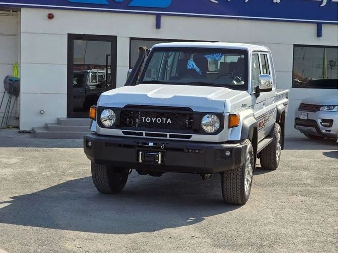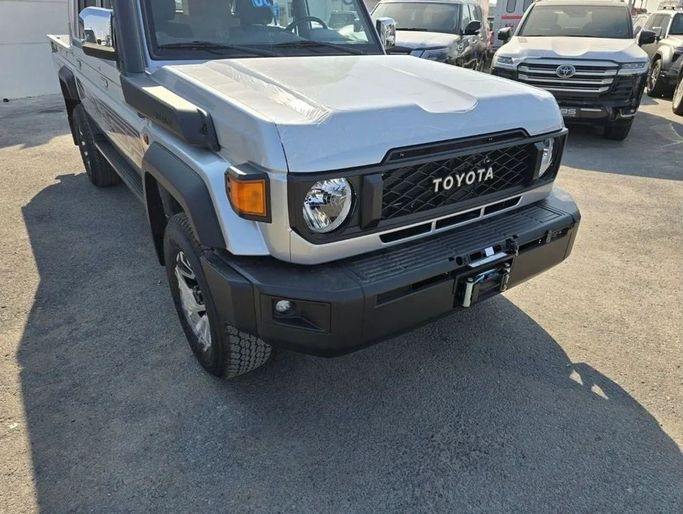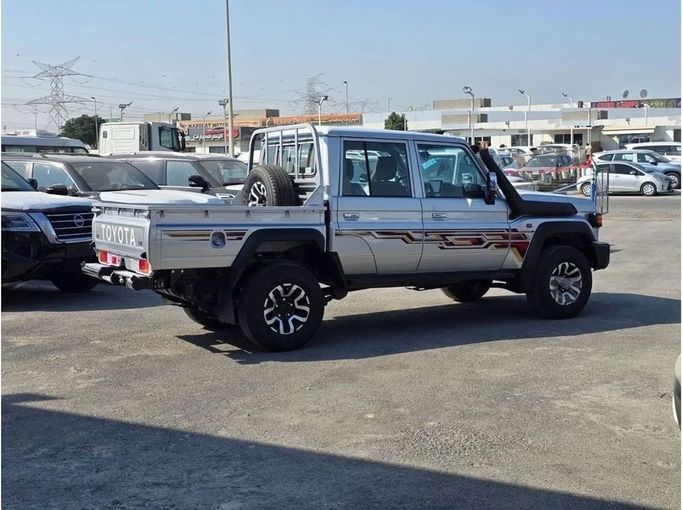 The new Toyota Land Cruiser 70 Series Facelift 2, built in 2025, is a double-cab pickup truck equipped with a 2.8-liter diesel engine and an automatic transmission. It offers a power output of 204 hp, while the AWD all-wheel drive ensures confident driving on various terrains. The body color is silver, and the vehicle conforms to GCC specifications. It also comes with a warranty valid until 02/01/2027. - New Year 2025 - Land Cruiser 70 Facelift - Double cab pickup truck - 2.8 L diesel - 204 hp - AWD all-wheel drive