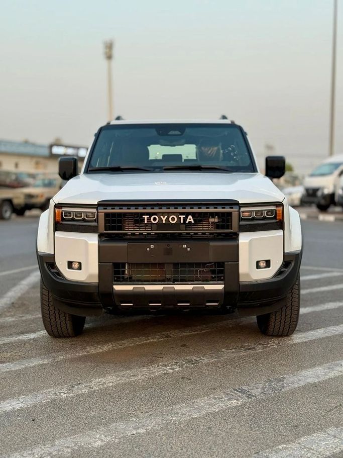 New for 2025, the Toyota Land Cruiser Prado 250 Series in white is a five-door SUV that blends rugged capability with everyday refinement. It is powered by a 2.4-liter petrol engine delivering 279 horsepower, paired with a smooth automatic transmission and standard all-wheel drive for confident performance on roads and light terrain. The GCC-spec version is tuned to regional conditions, offering a calm, composed ride and a practical, versatile interior with comfortable seating and thoughtful storage. Its design carries the Prado’s muscular silhouette and a refined cabin tha