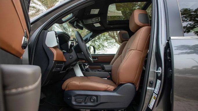 The 2025 Toyota Tundra 1794 Edition is a full-size luxury pickup truck that blends rugged capability with premium craftsmanship. Under the hood, it boasts a 3.4-liter twin-turbo V6 engine, delivering 389 horsepower and 479 lb-ft of torque, paired with a 10-speed automatic transmission. Designed for both power and refinement, it features a CrewMax configuration with four doors, offering spacious seating for five passengers. The interior is adorned with premium Saddle Tan leather, woodgrain accents, and heated and ventilated front seats, creating a sophisticated yet rugged at