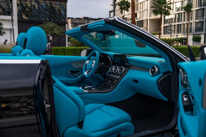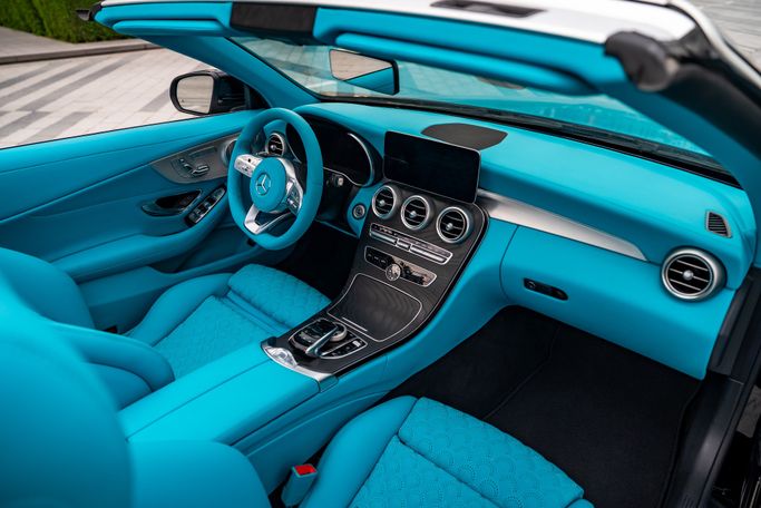 This 2021 Mercedes-Benz C-Class Cabriolet (W205 facelift) offers a refined open-air experience with everyday practicality. Built as a four-seat convertible, it combines a comfortable ride with Mercedes-quality materials, and its all-wheel-drive system provides capable handling in varied conditions. The 2.0-liter turbocharged engine delivers 258 hp, paired with an automatic transmission for smooth, confident acceleration on both city streets and highways. The exterior is a deep black, while the interior features light blue upholstery that adds a bright, upscale contrast. Ins