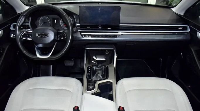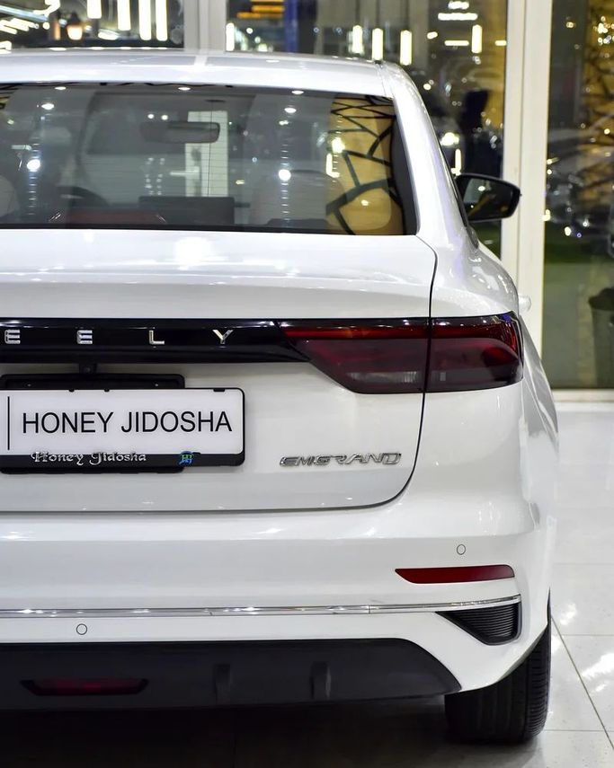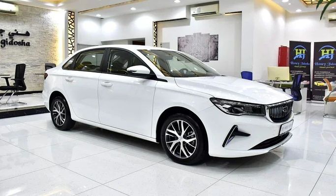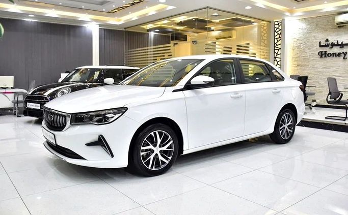 Geely Emgrand 2024. White exterior, beige interior. GCC Specs. 55,000 km. Full options: Bluetooth, cruise control, rear view camera, side airbags, fabric seats, parking sensors, temperature control, digital clock, remote key, push button start, power mirrors/windows/locks, alloy rims, FM/USB/MP3. Warranty. Finance AED 517/month for 5 years. Dealer: Honey Jidosha Motors.