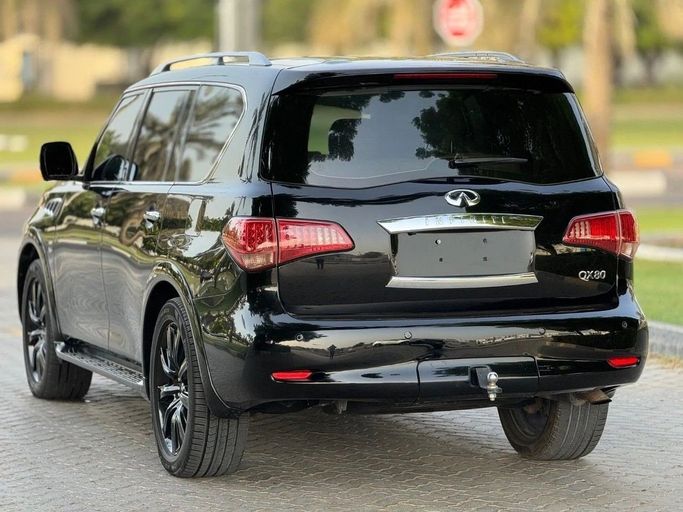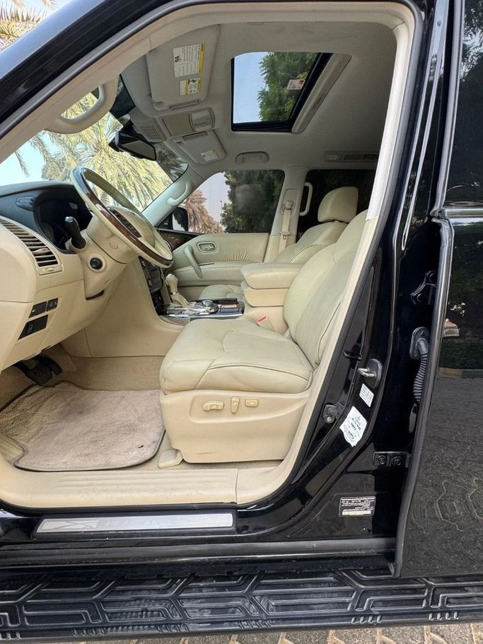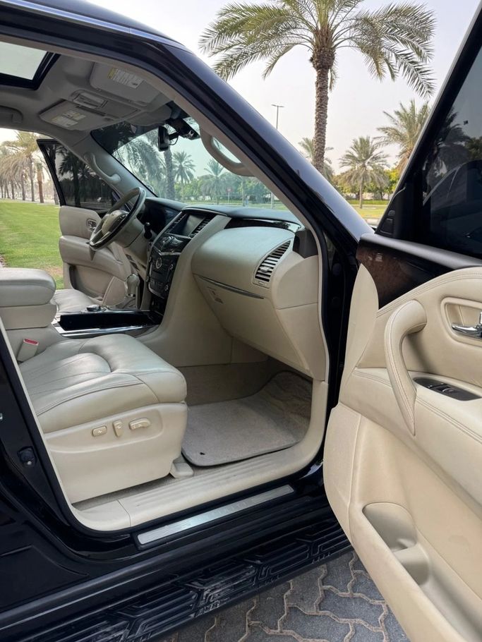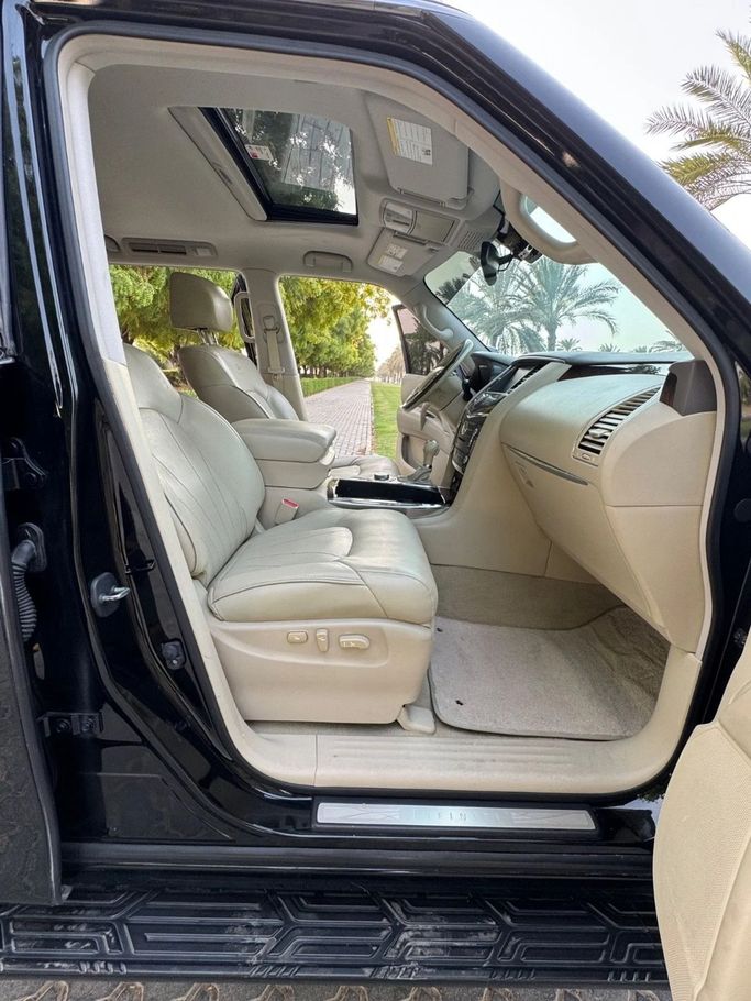 2014 Infiniti QX80 for sale, Gulf model, equipped with three screens, five cameras, radar, and full options. Safety Features: - 4WD - Adaptive lighting - Front wheel drive - LED headlights - Performance kit (tuned) - Rear wheel drive - Xenon headlights - Blind spot detection mirror Exterior Features: - Moonroof - Off-road kit - Off-road tires - Performance tires - Premium paint - Roof rack - Sport package - Sport suspension Interior Features: - AUX audio input - Air conditioning - Alarm system - CD player - Cooled rear seats - DVD player - MP3 interface - Power seats wit
