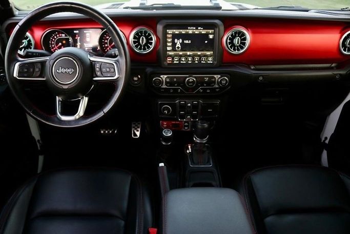 Jeep Wrangler Pickup Gladiator Rubicon 2021 four-door pickup truck with a 3.6-liter six-cylinder engine in showroom-like condition. No accidents or repainting. Complete package No. 1 includes automatic transmission, white exterior, black-and-red leather interior, dual exhaust pipes, differential lock, aluminum alloy wheels (20 inches), multi-function 7-inch touchscreen multimedia display, navigation system, eco mode, fully automated controls, cruise control, fingerprint engine start, remote engine start, multifunctional seats, cooled and heated seats, two surveillance camer