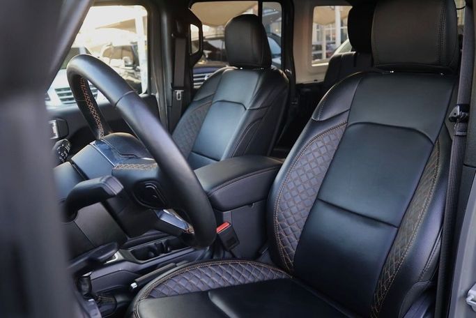 Jeep Wrangler Sahara 2023 hybrid in showroom condition, accident-free, unpainted, fully loaded. Features include automatic transmission, grey exterior, black leather interior with red accents, dual exhaust, locking rear differential, large wheel rims, display screen, navigation system, eco driving mode, fully automated control, cruise control, fingerprint engine start, and remote engine start. Mileage: 20,000 km Price: 145,000 UAE Dirhams Monthly payment with down payment: 2,300 Dirhams Monthly payment without down payment: 3,000 Dirhams Bank financing available w