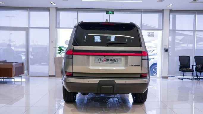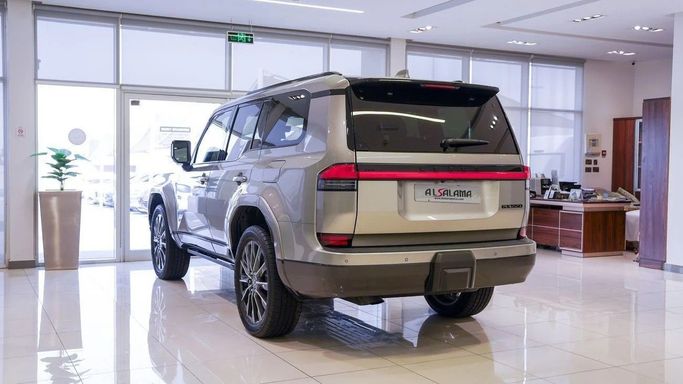 Pre-owned Lexus GX550 for sale in Dubai. Silver 2025 model, available at Al Salama Motors. This vehicle features automatic transmission, 6 cylinders, 22-inch wheels, and a brown interior. It has only 5,000 km and comes with American specifications.