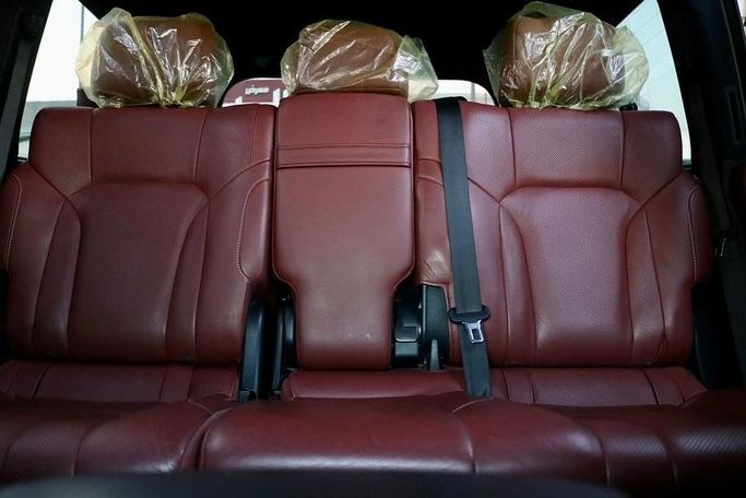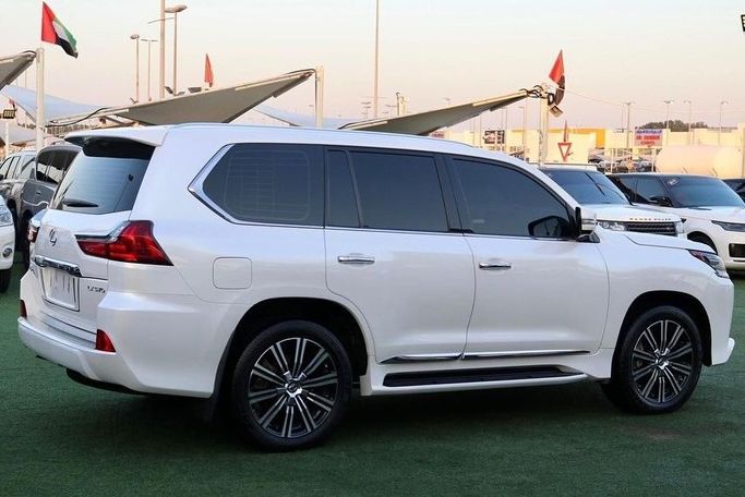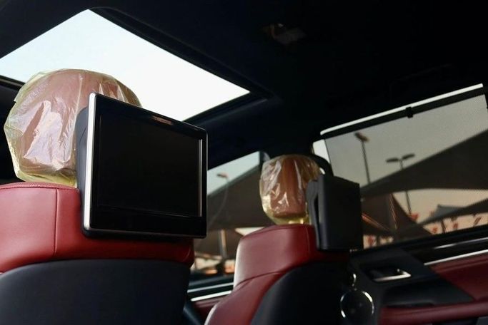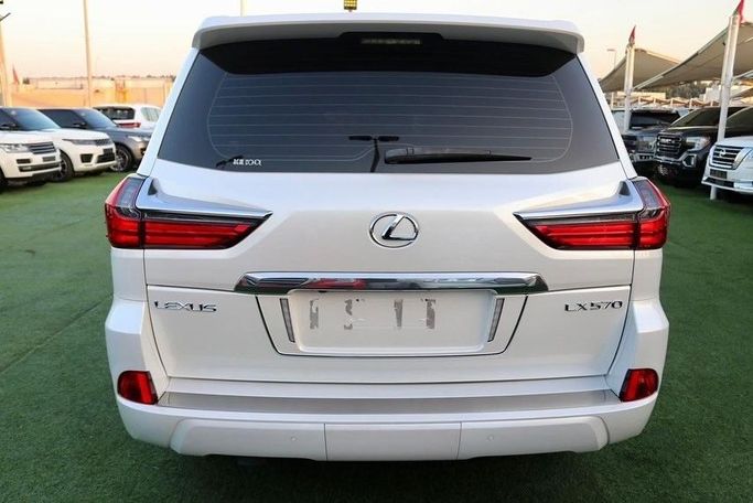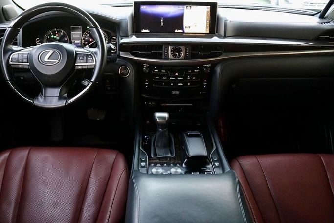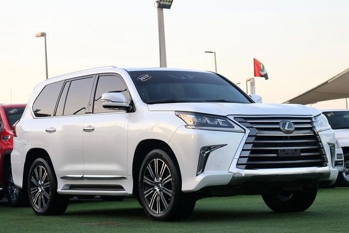 LEXUS LX570 2019 GCC Lexus 2019, showroom-like condition, serviced at the authorized dealer workshop, painted by the authorized dealer, under factory warranty, no accidents, Full Option Package No. 1: Pearl White exterior, purple leather interior, three screens, five cameras, radar, panoramic roof, cooling and heating seats, lane departure warning system, electrically controlled hood latch, front and rear seats with cooling and heating function, rear passenger seat controls, hydraulic suspension, blind spot monitoring system, front and rear parking sensors, heads-up displa