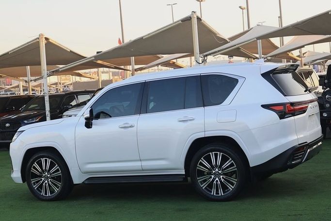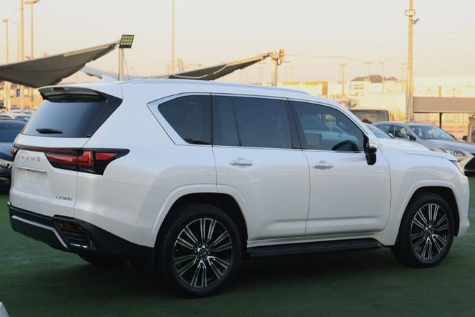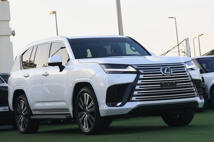 Lexus LX600 Signature 2023, V6 Twin-Turbo 3.5L engine, designed for GCC countries, officially serviced by Al-Futtaim. The vehicle is in impeccable condition with an original paint job and no signs of repairs. Full specification includes: pearl white exterior, red and black leather interior, black suede headliner, seating for seven, 360-degree camera system with five cameras, panoramic sunroof, two touchscreen displays with Apple CarPlay support, power assist doors, parking sensors, off-road driving mode ("Crawl Control"), navigation system, blind spot monitor, power tailgat