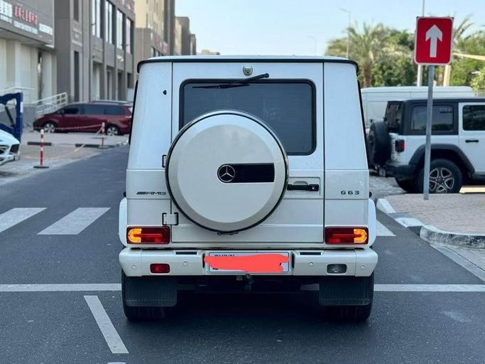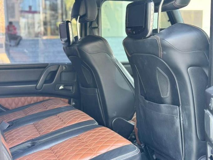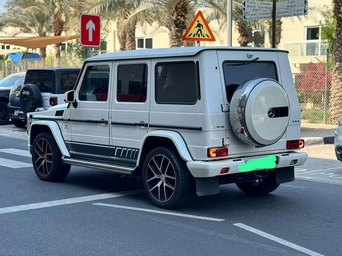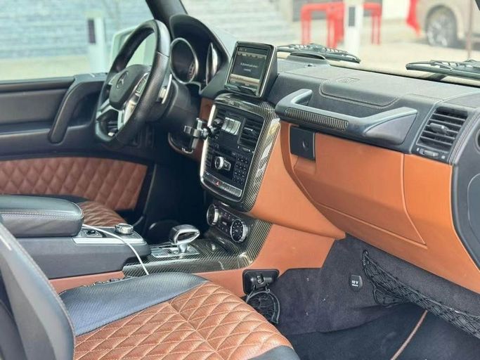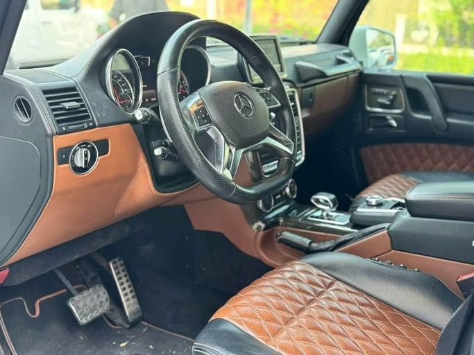 This is the 2016 Mercedes-Benz G-Class AMG, the W463 Facelift 3rd generation. It is a five-door SUV powered by a 5.5-liter V8 engine producing 571 hp, equipped with an automatic transmission. The all-wheel drive provides confident grip on all roads. The white body color highlights the solidity and recognizable silhouette of the G-Class, while the AMG modification adds character and dynamics. The car has had one owner, and its mileage of about 120,000 km is evidence of careful operation and good condition. The interior combines premium comfort with modern technology, and the
