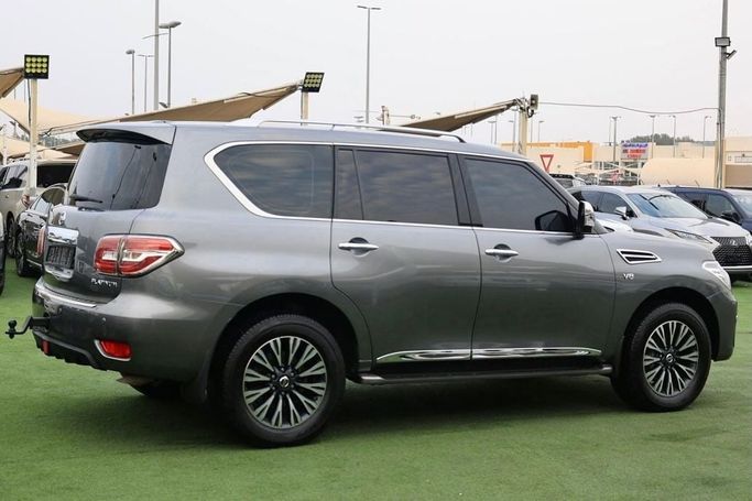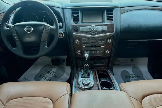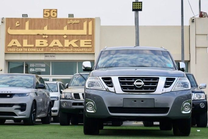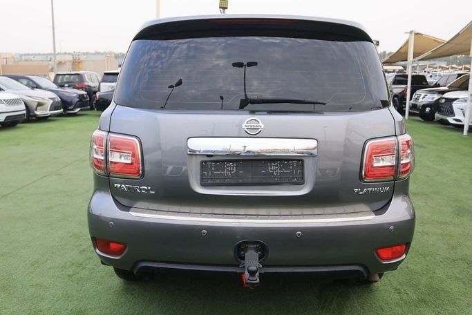 Nissan Patrol SE V8 2015 Titanium Nissan Patrol Titanium V8 2015 in excellent condition. Full Option Package No. 1 includes a gray exterior and orange leather interior. Features panoramic roof, Alcantara ceiling, three screens, five cameras, parking sensors, electric hood latch, navigation system, rear DVD screens, cruise control, seat cooling and heating, and an electronic instrument cluster with ID indicators. This vehicle is equipped with top-level specifications.