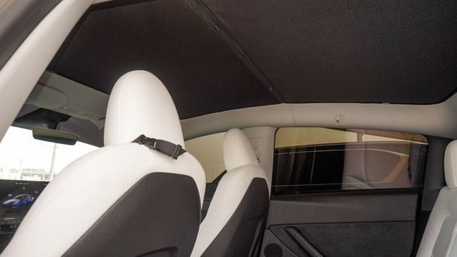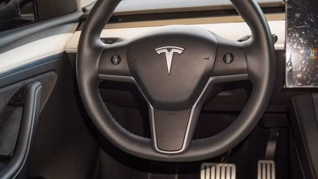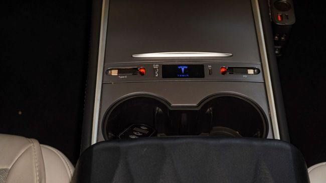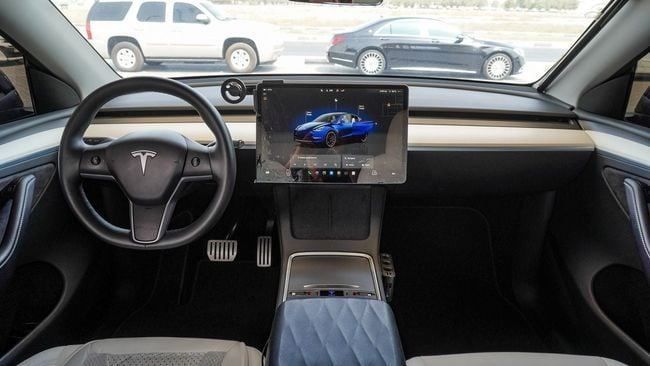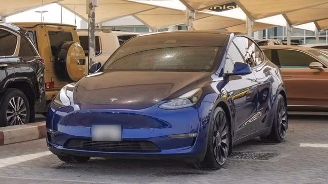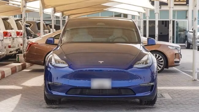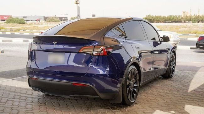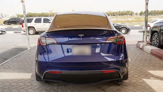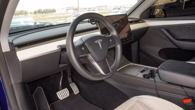 2023 blue Tesla Model Y with white interior. Automatic gearbox.