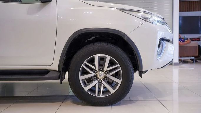 Pre-owned Toyota Fortuner for sale in Dubai. White 2016 model, available at Al Salama Motors. This car has automatic transmission, 6 cylinders, 18″ wheels and brown interior. 141,000 km, GCC specs.