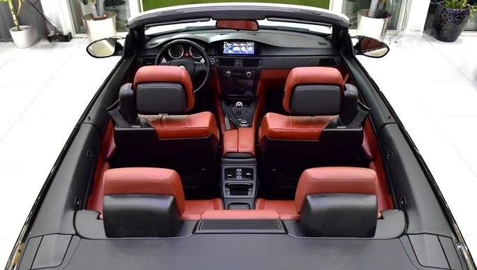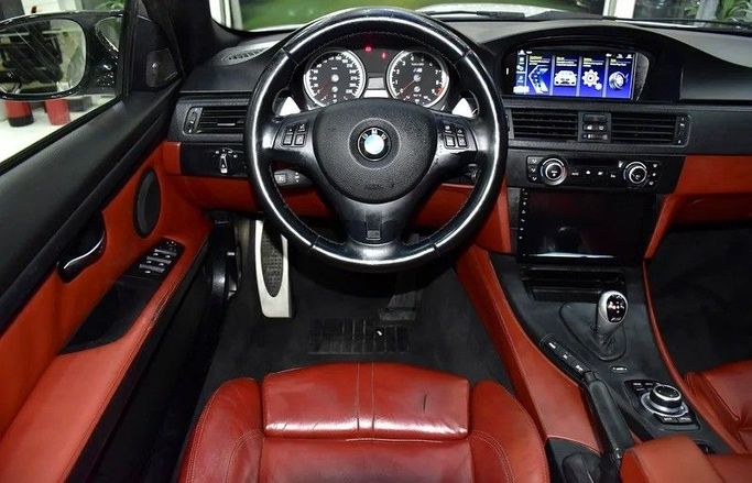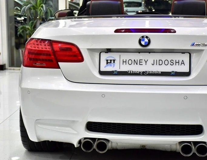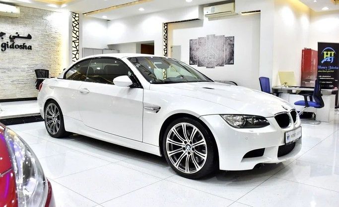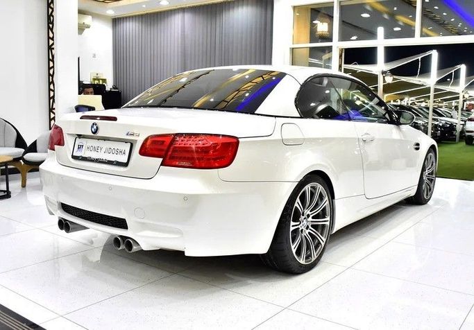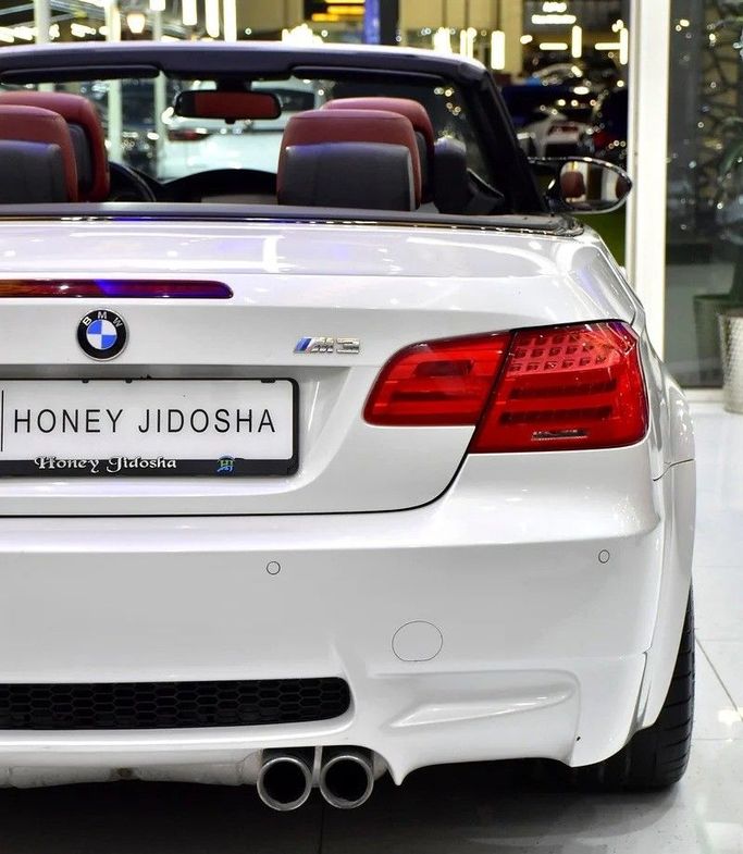 BMW M3 Convertible 2011, white exterior, tan leather interior, GCC Specs, 145,000 km. V8 engine, hard top convertible, 4 seats, Bluetooth, Harman/Kardon, cruise control, paddle shifters, leather power seats, navigation, parking sensors, side airbags, quad exhaust, FM/CD/MP3, alloy rims. Dealer: Honey Jidosha Motors. Price: 90,000 AED.