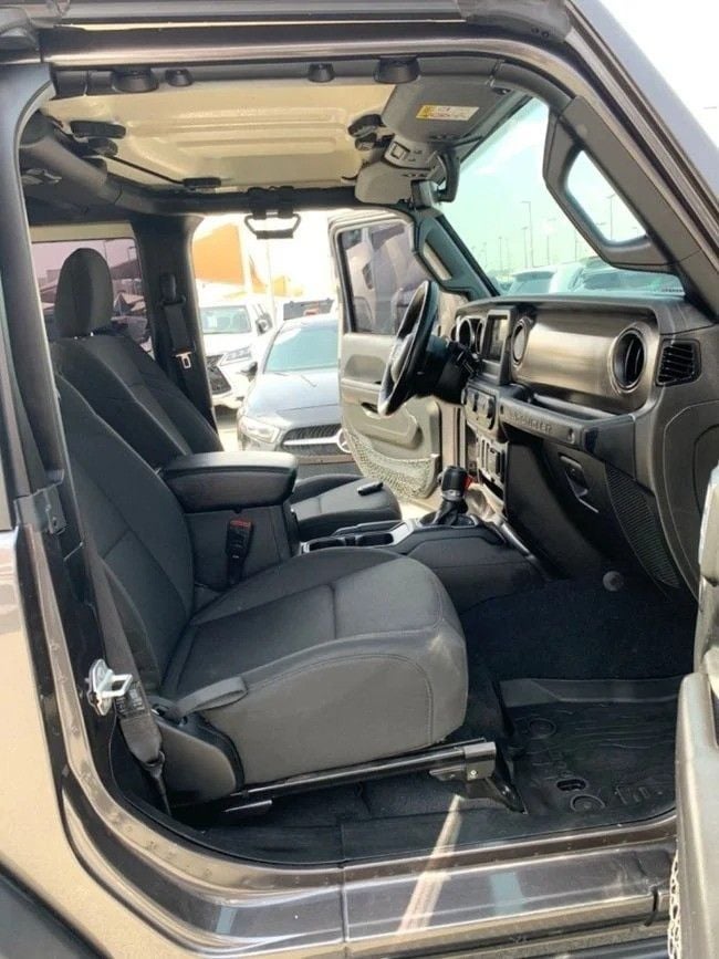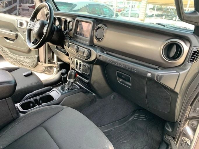 Jeep Wrangler Sport, Gulf. This vehicle features full specifications including a large screen, camera, fingerprint start, and blind spot monitoring. It is a four-wheel drive model with original paint, is accident-free, and is in very clean condition. The exterior is gray with a black interior. Safety Features: - 4WD - Adaptive lighting - LED headlights - Xenon headlights Exterior Features: - Performance tires - Premium paint Interior Features: - Air conditioning - CD player - DVD player - Infotainment system - Bluetooth connectivity Comfort & Convenience: - Tinted windo
