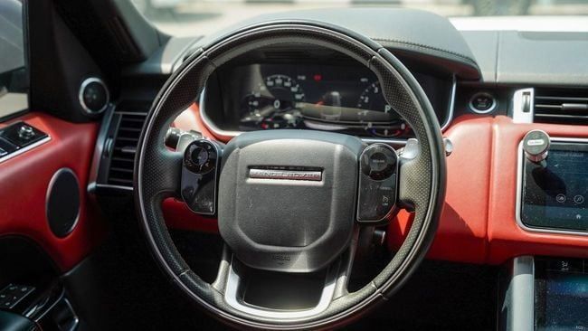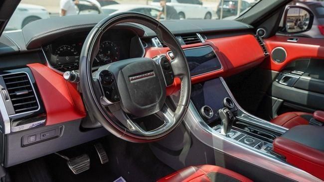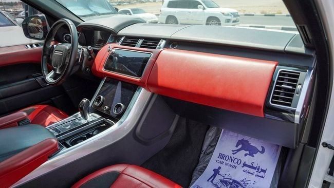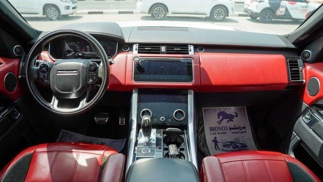 Pre-owned Land Rover Range Rover Sport for sale in Sharjah. White 2018 model, available at Al Nujoom Al Malakiah Used Cars. This car has automatic transmission, 6 cylinders, 21″ wheels and red interior. 179,412 km, GCC specs.