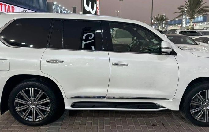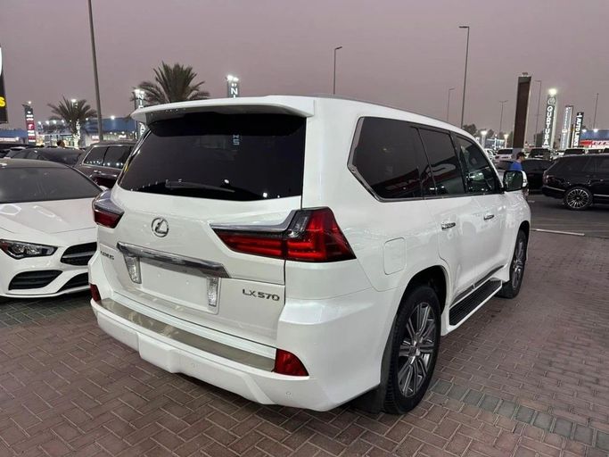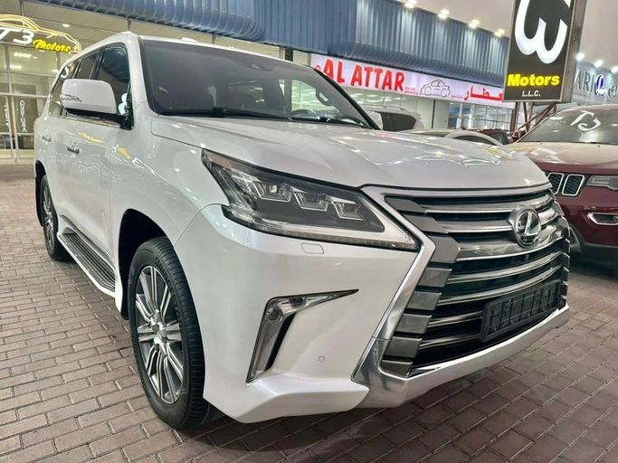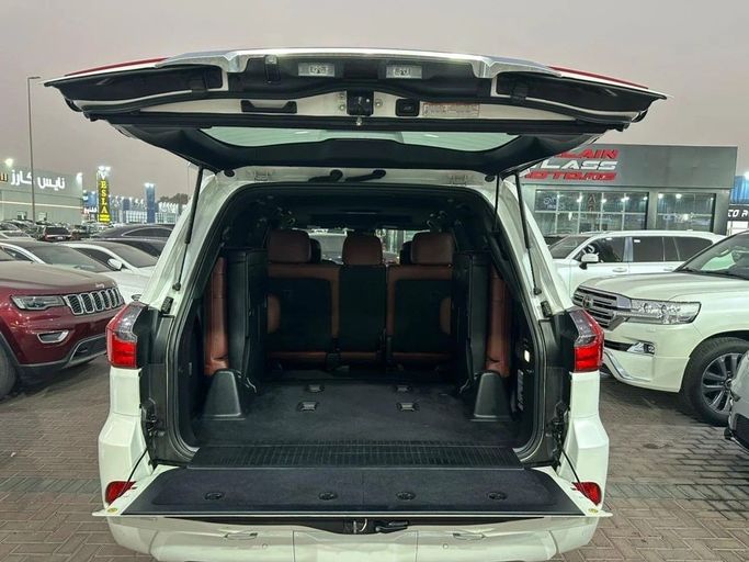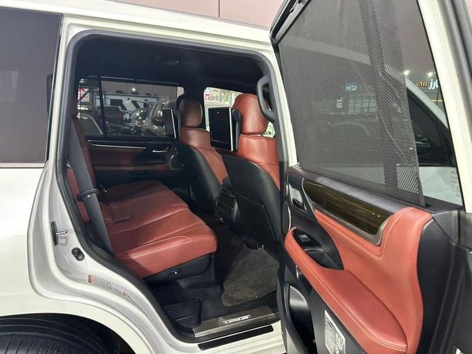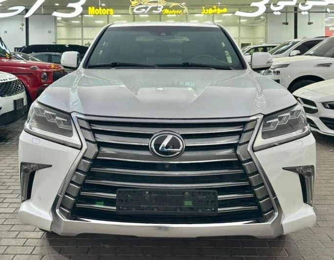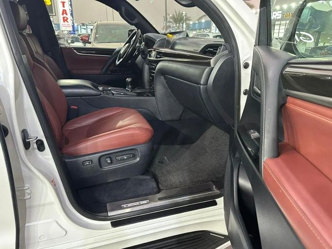 Lexus LX570, GCC specifications, top-of-the-line, fully loaded with leather seats, sunroof, large screen, rearview camera, push-button start, and blind spot monitoring. The vehicle is in excellent condition, featuring a white exterior with a red interior. Interior Features: - AUX audio input - Air conditioning - CD player - DVD player Exterior Features: - Performance tires Safety Features: - 4WD - Rear-wheel drive - Xenon headlights Comfort & Convenience: - Fridge - Power locks - Tinted windows - Front parking sensors - Self-parking capability - Heads-up display Infota
