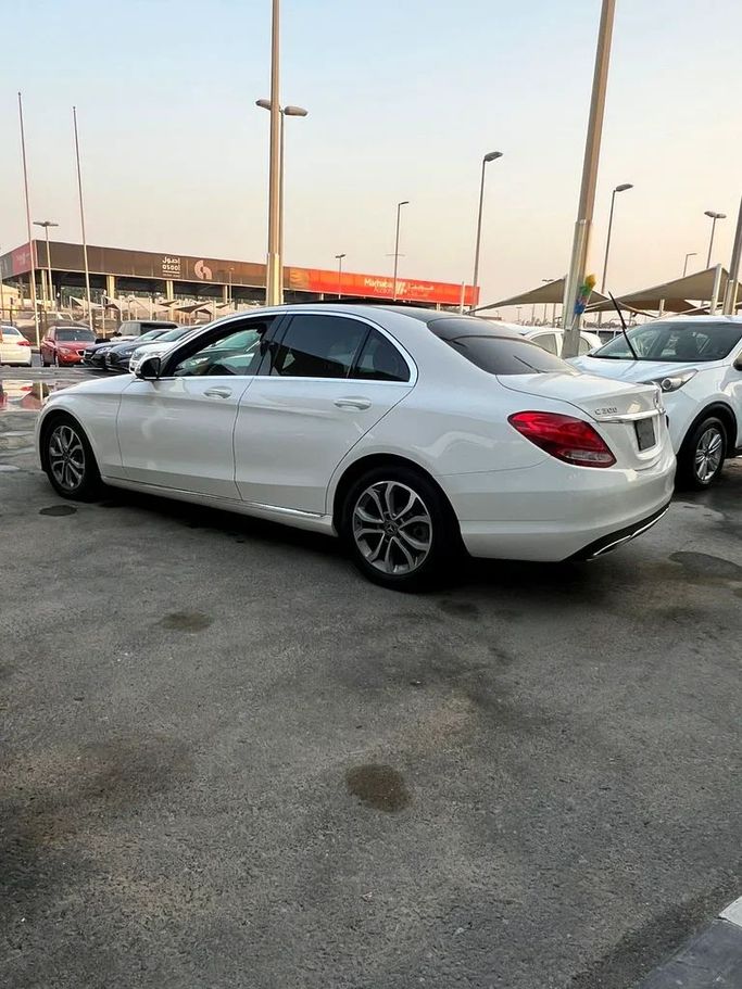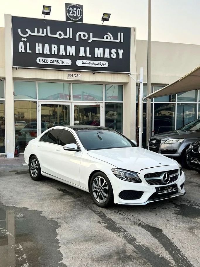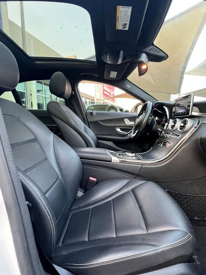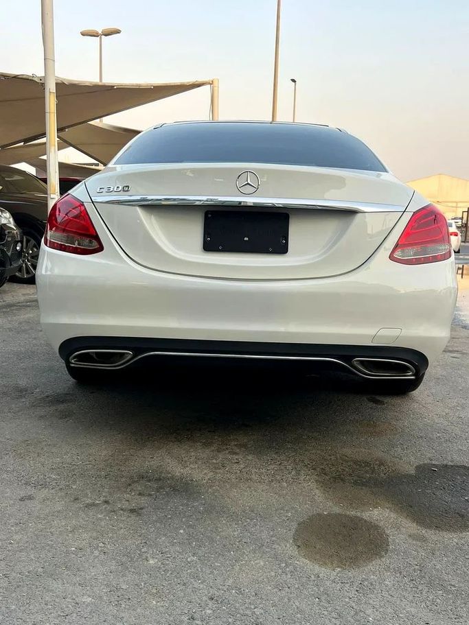 For sale: 2018 Mercedes C300, imported, in excellent condition. Features include a sunroof, leather upholstery, screen, camera, sensors, and distinctive rims. The exterior is a unique white color with a black interior. The vehicle comes with a 6-month warranty.