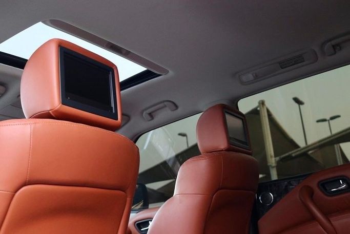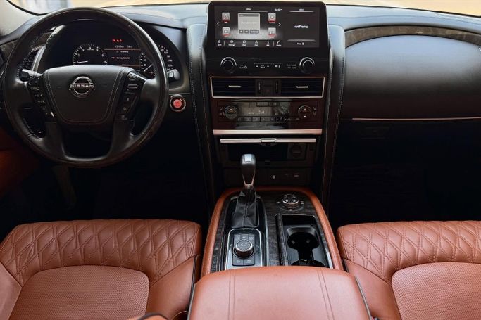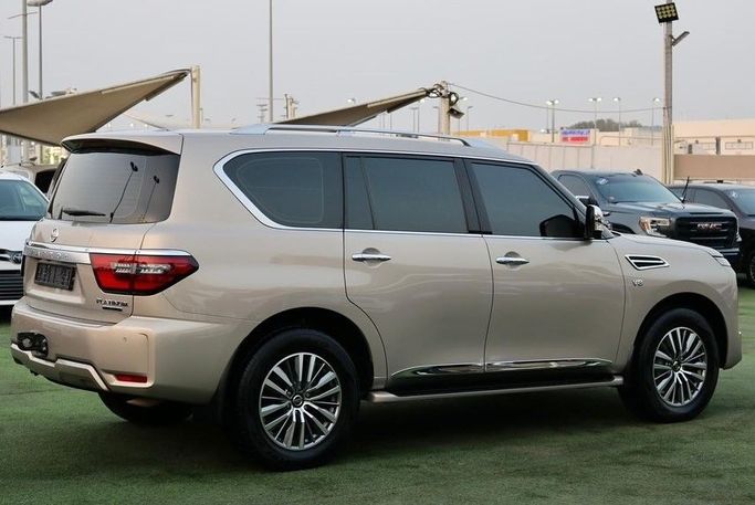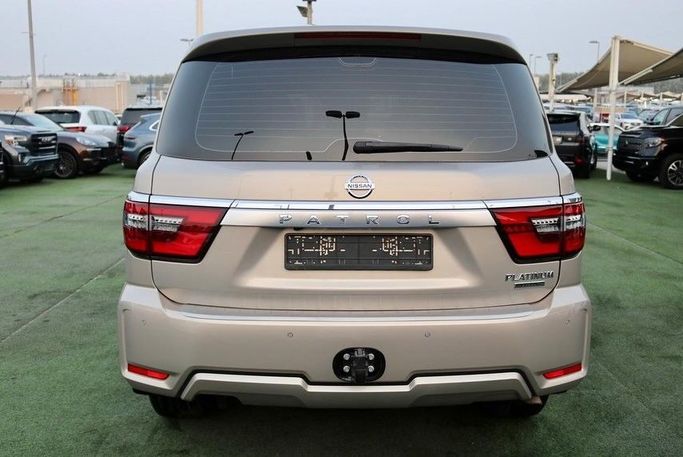 Nissan Patrol Platinum LE 2021, big engine, showroom-like condition, no accidents or repainting, Full Option Package No. 1: new Rose Gold exterior, orange leather interior, ample seating, panoramic roof, three screens, five cameras, parking sensors, electric hood latch, seven-speed transmission, radar, blind spot monitoring system, navigation system, rear DVD monitors, cruise control, cooled and heated seats, digital instrument cluster with identity elements, eco-driving mode, lane departure warning system, top-level specifications. Mileage: 119,000 km Price: 175,000 AED M