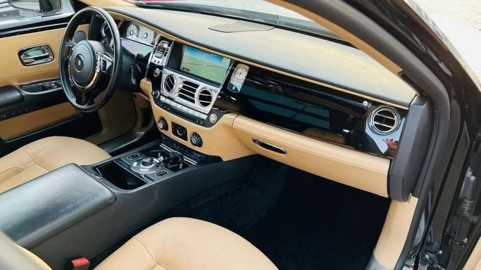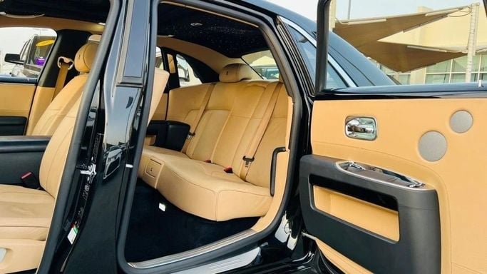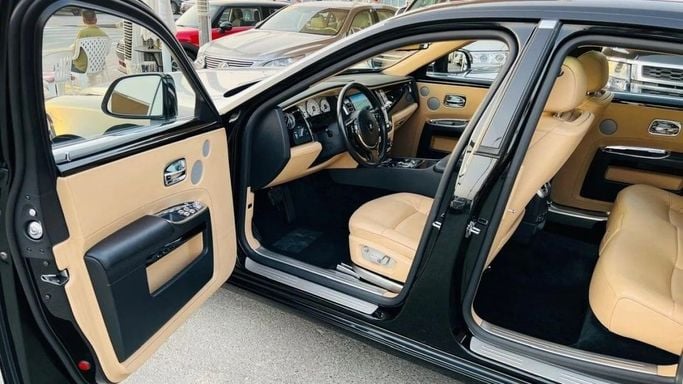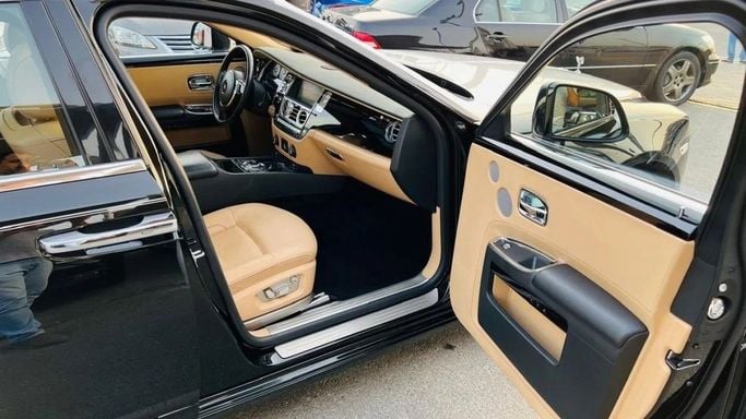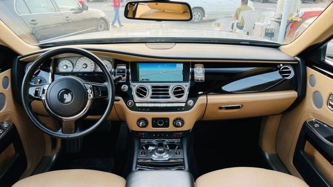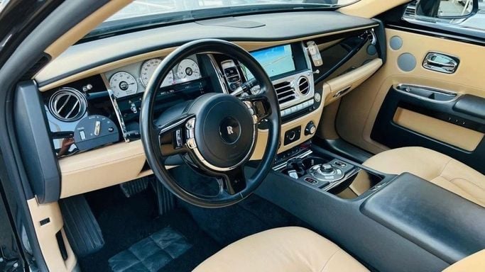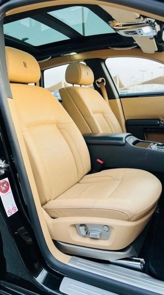 Rolls-Royce Ghost For sale: a pristine Rolls-Royce Ghost featuring full specifications. This vehicle is finished in a sleek black exterior with a luxurious camel interior. It is accident-free, has original paint, and is very clean. Interior Features: - Climate control - Cooled front seats - Cruise control - Leather seats - Power seats - USB connectivity Exterior Features: - Sunroof - Fog lights - Keyless entry Safety Features: - ABS (Anti-lock Braking System) - Front and side airbags - Adaptive cruise control Comfort & Convenience: - Navigation system - Rear parking se