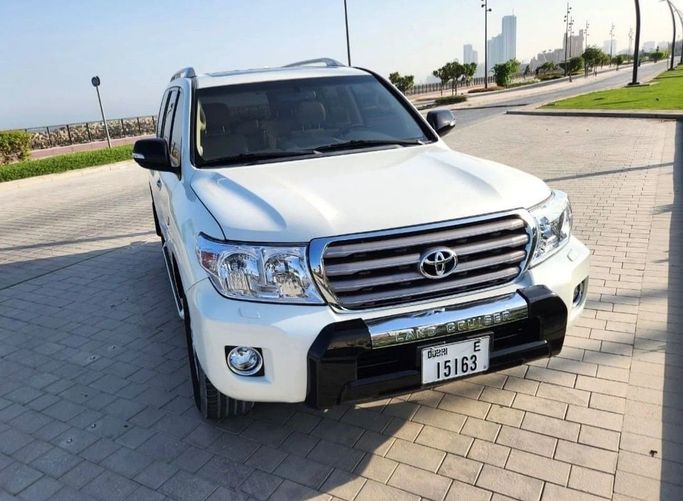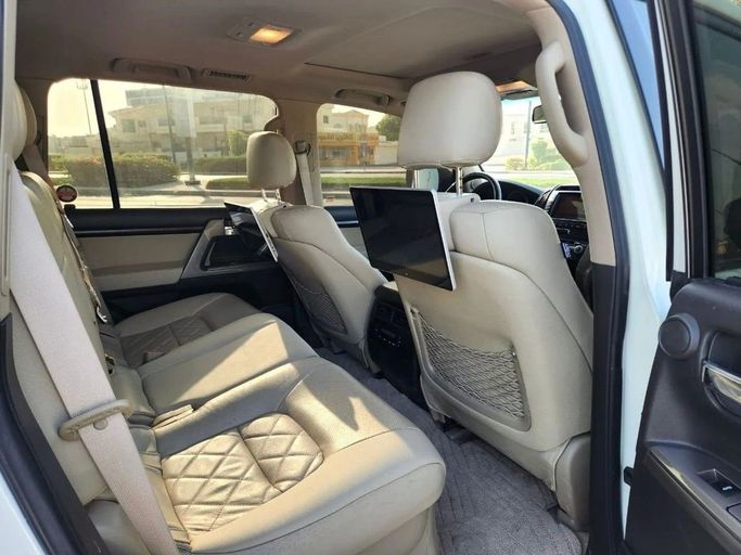 Toyota Land Cruiser VXR V8 5.7, Gulf specification, number one, fully equipped with options including leather seats, sunroof, large screen, camera, fingerprint start, and blind spot monitoring. The exterior color is white with a beige interior. Interior Features: - Air conditioning - CD player Exterior Features: - Performance tires Safety Features: - 4WD - Xenon headlights Comfort & Convenience: - Fridge - Power locks - Tinted windows Infotainment: - Bluetooth system - Rear TV screens - USB and Auxiliary cable - CD/DVD player