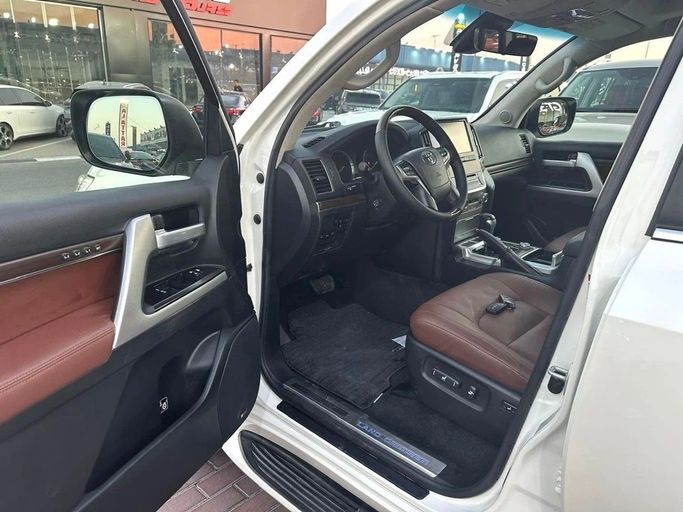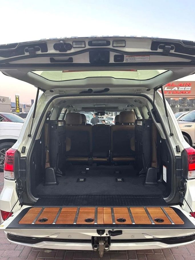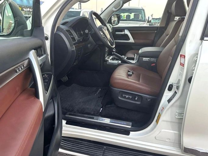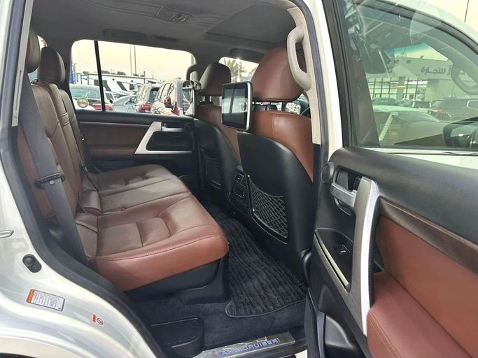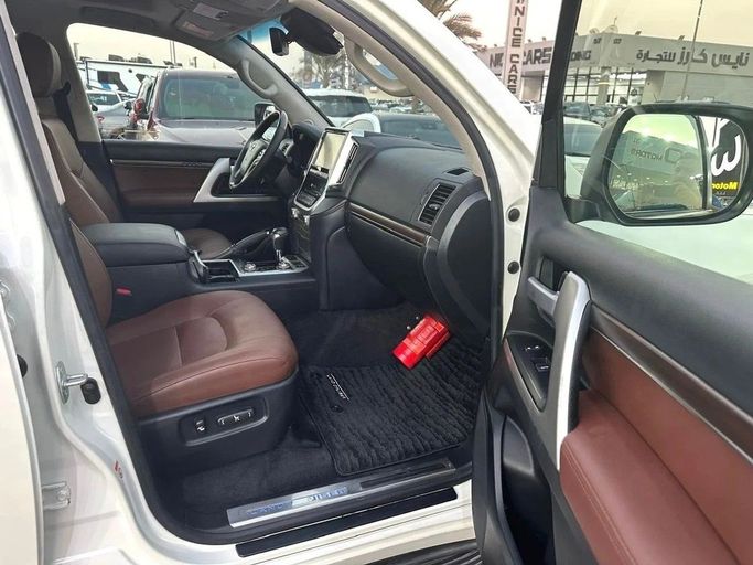 Toyota Land Cruiser VXR V8 5.7 GCC specification, top-of-the-line, fully loaded with leather interior, sunroof, large screen, camera, push-button start, and blind spot monitoring. Original paint, full service history up to 160,000 km. Very clean, no accidents. White exterior, brown interior. Interior features: - Air conditioning - CD player - DVD player - MP3 interface - Power seats with memory Exterior features: - Performance tires - Premium paint Safety features: - 4WD - Adaptive lighting - LED headlights - Rear-wheel drive - Xenon headlights Comfort & Convenience: -