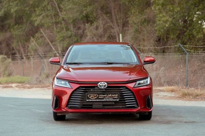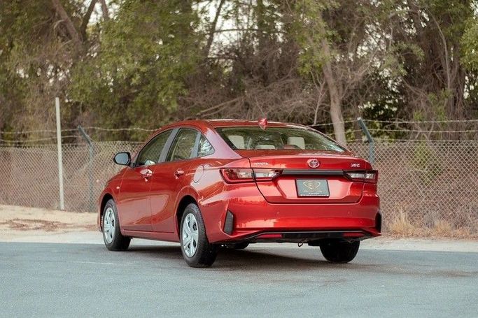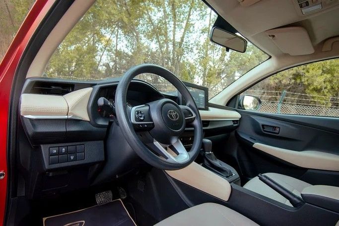 This 2023 Toyota Yaris IV sedan in red is powered by a 1.5-liter gasoline engine delivering 105 horsepower, paired with a continuously variable transmission for smooth, efficient progression. Front-wheel drive and the compact sedan form support confident city driving and everyday practicality. With a single previous owner and 52,872 kilometers on GCC-spec hardware, it reflects Toyota reliability and a well-kept condition. Inside, the cabin emphasizes comfort and straightforward controls, while the CVT helps maintain a relaxed pace on longer trips. The red finish and clean l